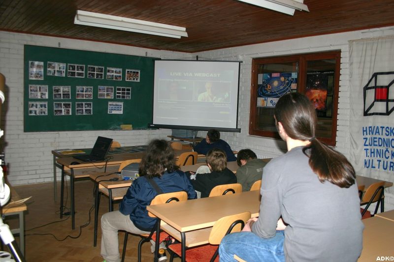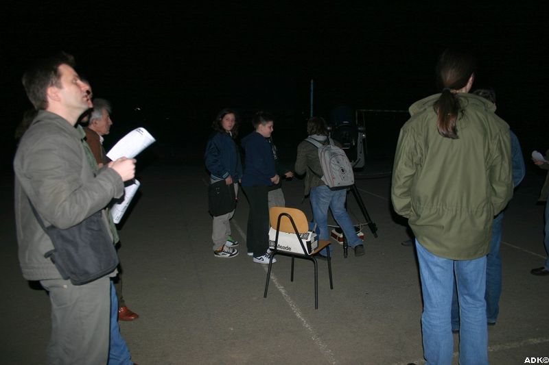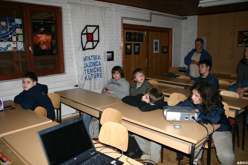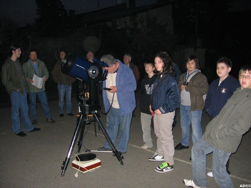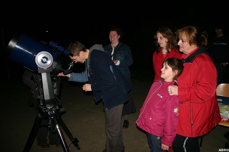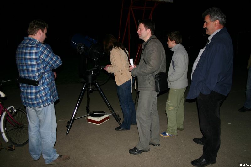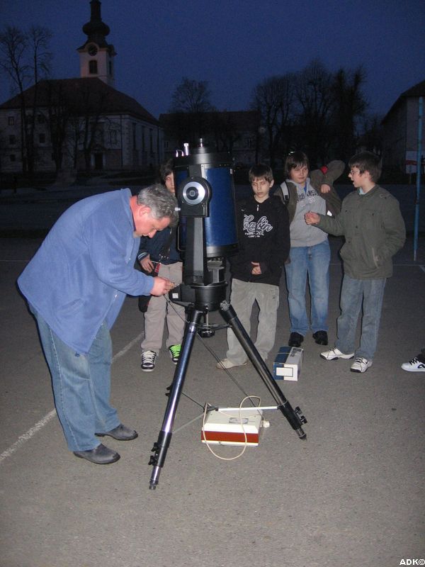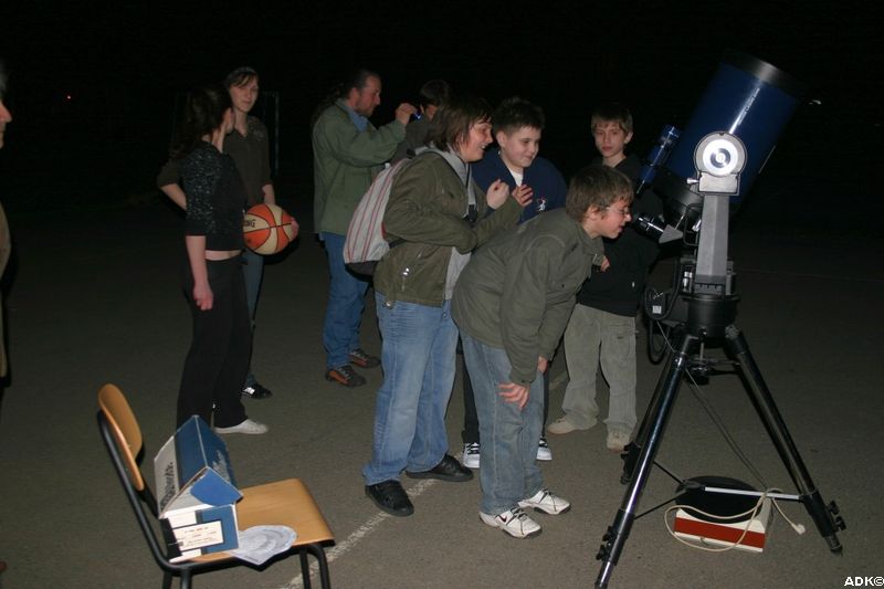 U petak 3. travnja oko 18 sati skupilo se desetak članova našeg društva u učionici Doma Zajednice tehničke kulture. Zidove i školsku ploču ukrasili smo izložbenim materijalima: plakatima na temu Međunarodne godine astronomije i astronomije općenito te fotografijama iz dvanaestogodišnje povijesti naše udruge. Pripremili smo računalo s pristupom internetu i projektor, ali kako još nije bilo zainteresiranih građana, prikazali smo našim članovima nekoliko sadržaj s Astrovizije i prenosili dijelove emitiranja uživo s velikih svjetskih zvjezdarnica. Oko 20 sati iznijeli smo naš teleskop (Meade LX200 10″ F/10) na igralište u blizini Doma ZTK, pripremili ga za promatranje i u 20:10 započeli promatranje. Odaziv je bio dosta slab: petnaestak naših članova i još desetak znatiželjnika, a na nebu se skupljalo i sve više oblaka pa smo nešto iza 21:30 završili promatranje i oko 22 sata aktivnosti za taj dan.