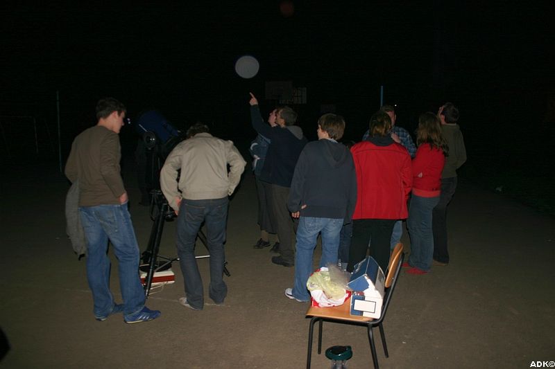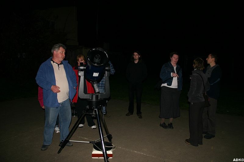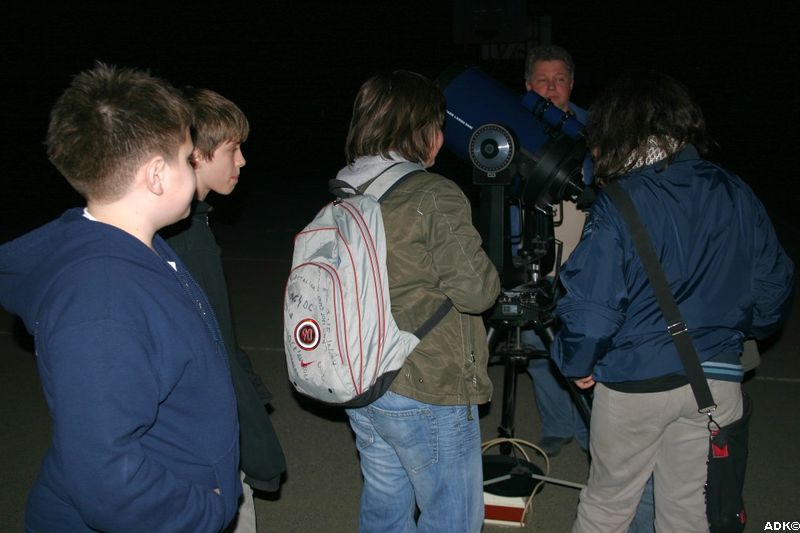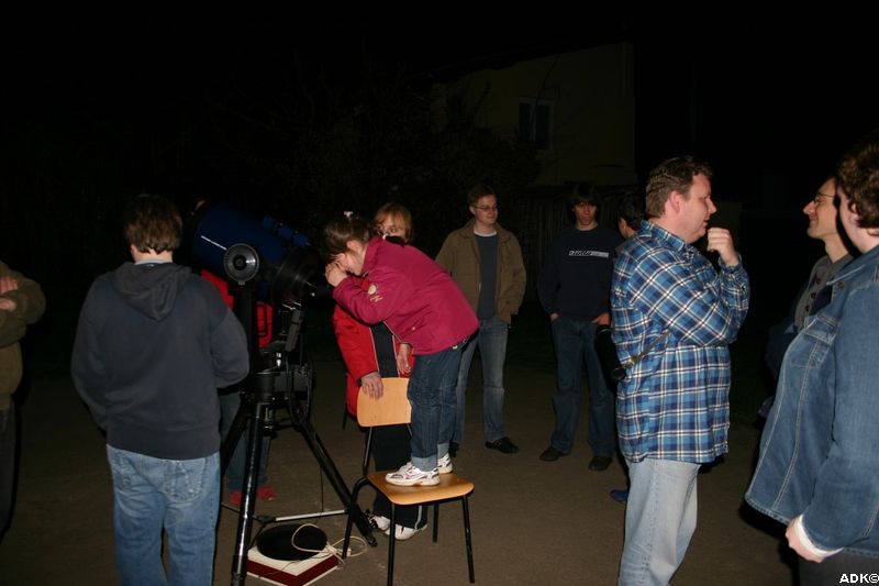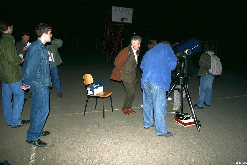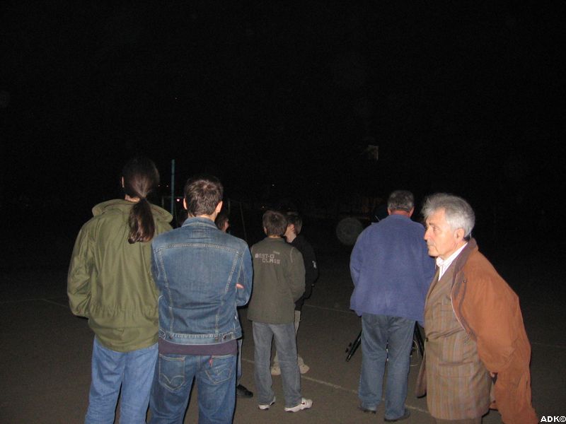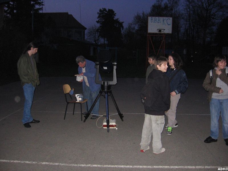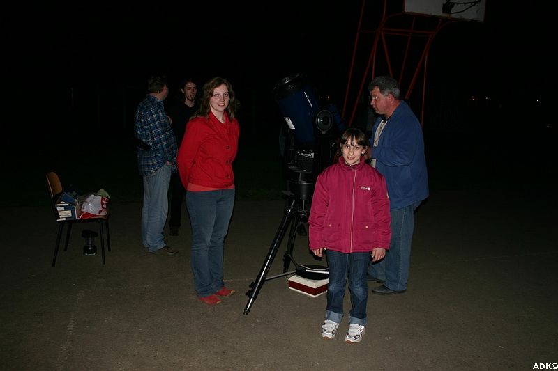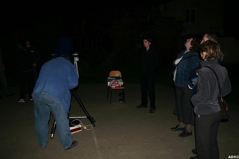 U petak 3. travnja oko 18 sati skupilo se desetak članova našeg društva u učionici Doma Zajednice tehničke kulture. Zidove i školsku ploču ukrasili smo izložbenim materijalima: plakatima na temu Međunarodne godine astronomije i astronomije općenito te fotografijama iz dvanaestogodišnje povijesti naše udruge. Pripremili smo računalo s pristupom internetu i projektor, ali kako još nije bilo zainteresiranih građana, prikazali smo našim članovima nekoliko sadržaj s Astrovizije i prenosili dijelove emitiranja uživo s velikih svjetskih zvjezdarnica. Oko 20 sati iznijeli smo naš teleskop (Meade LX200 10″ F/10) na igralište u blizini Doma ZTK, pripremili ga za promatranje i u 20:10 započeli promatranje. Odaziv je bio dosta slab: petnaestak naših članova i još desetak znatiželjnika, a na nebu se skupljalo i sve više oblaka pa smo nešto iza 21:30 završili promatranje i oko 22 sata aktivnosti za taj dan.